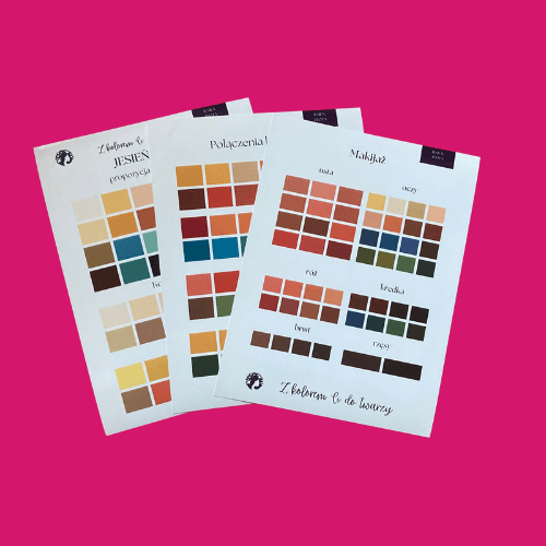 Wydrukowane na papierze fotograficznym palety kolorów w rozmiarze 15/20 cm. Możesz powiesić je np. w szafie. Ułatwi Ci dobór zestawień kolorystycznych ubrań.